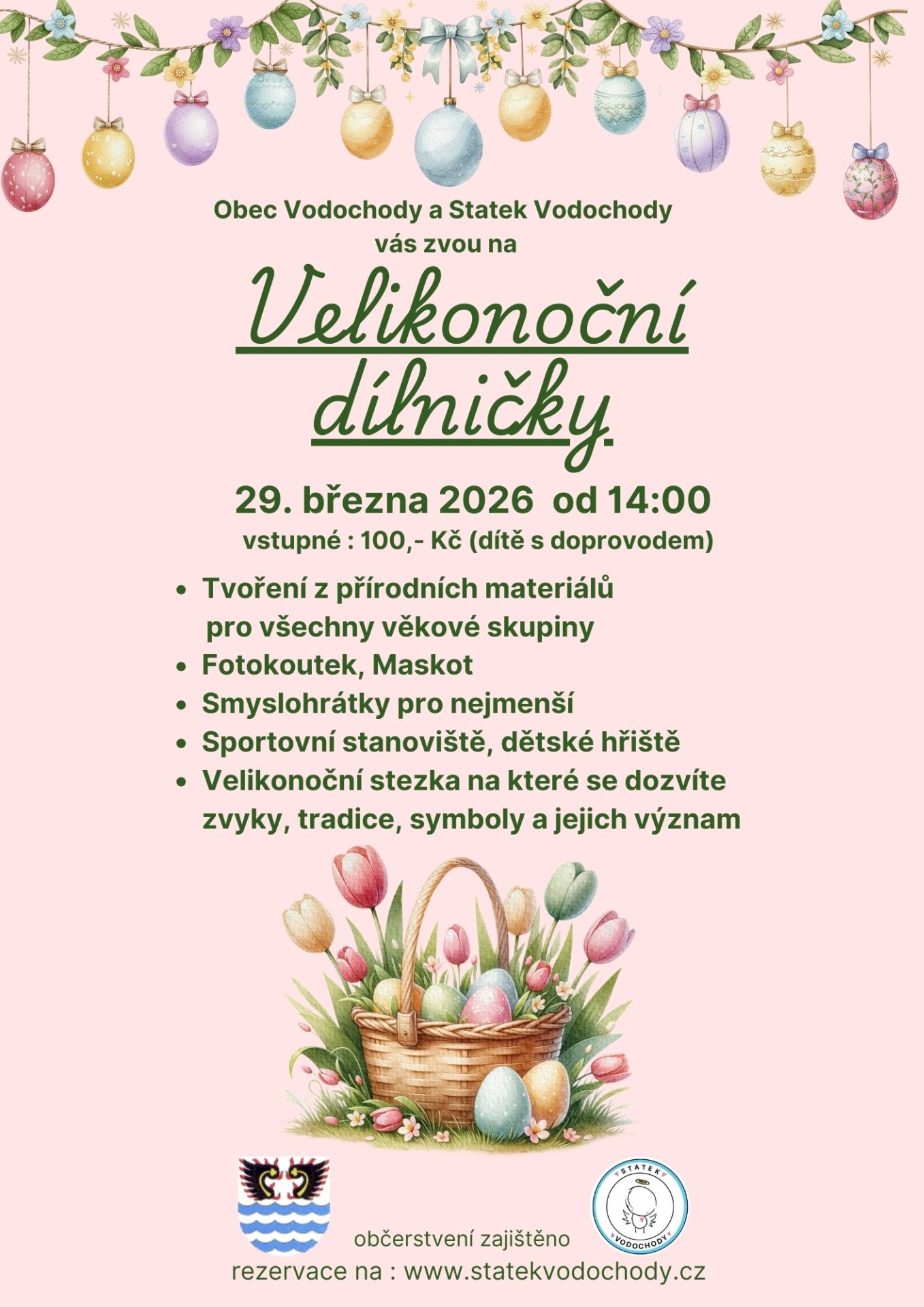 Přijďte s dětmi přivítat jaro na Statku Vodochody a užít si příjemné velikonoční odpoledne plné tvoření, her a tradic. Připravili jsme pro vás Velikonoční dílničky, kde si děti vyzkouší různé tvořivé aktivity, poznají velikonoční zvyky a stráví krásný čas na statku.